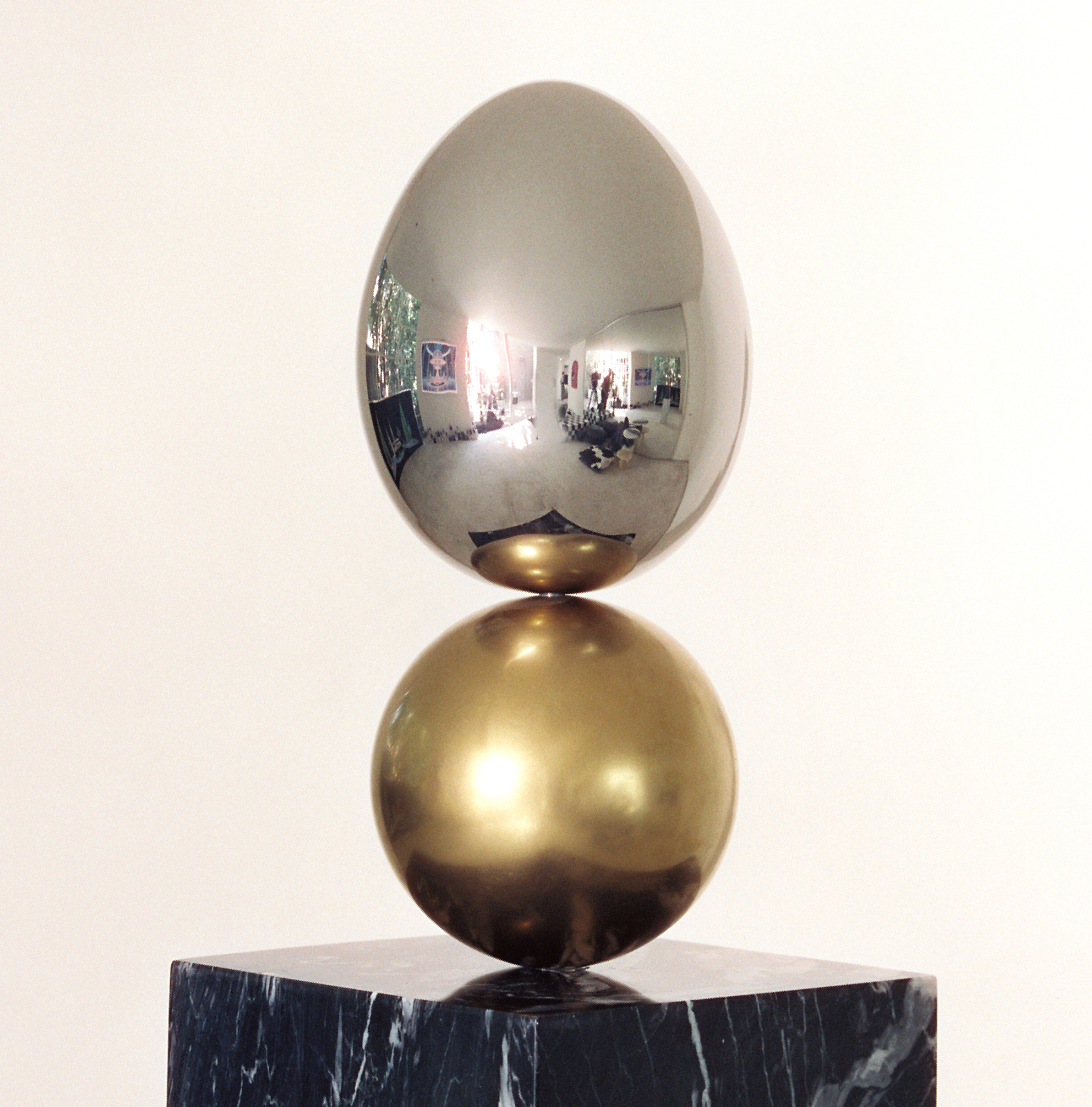 Egg of Reflection speaks to the cyclical rhythm of life and the threads that bind all things together. A cube of black marble, scattered with ancient fossils, anchors the work in geological time. Resting above it, a polished steel egg mirrors the world around it, drawing viewers into its surface and into their own reflections. The piece balances material history with a sense of possibility, offering a quiet space for contemplation.