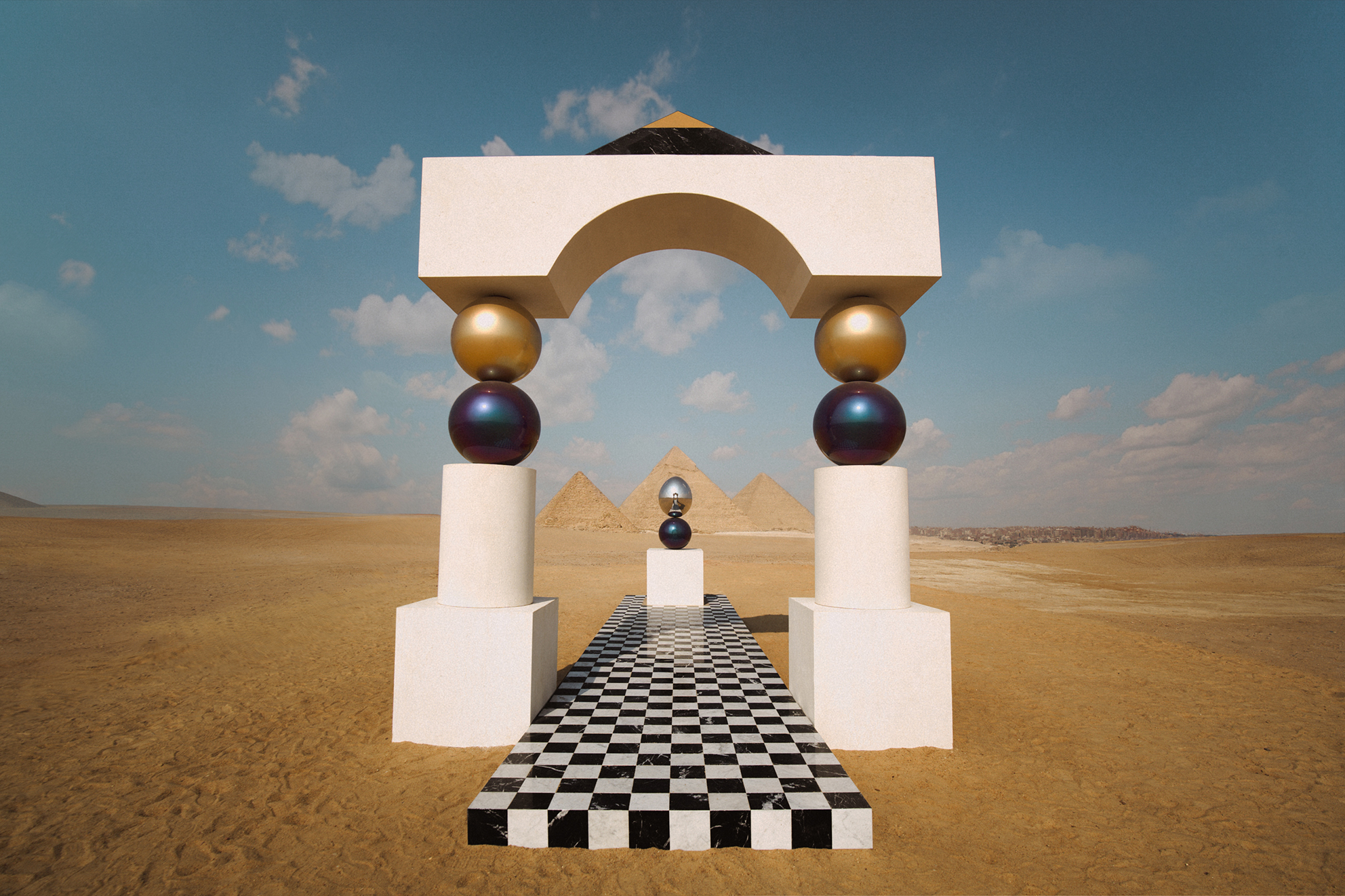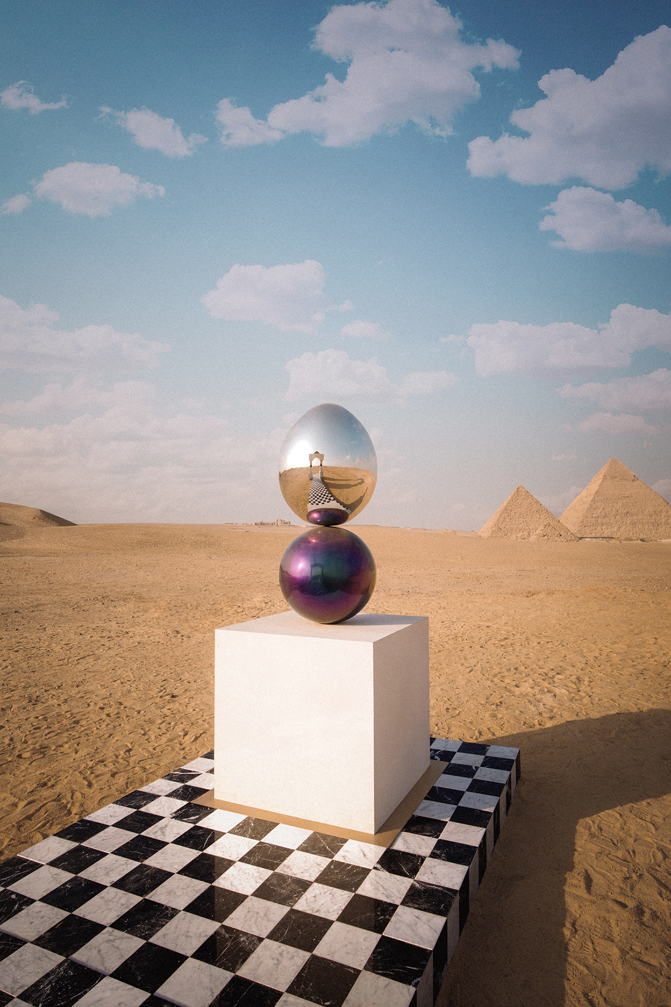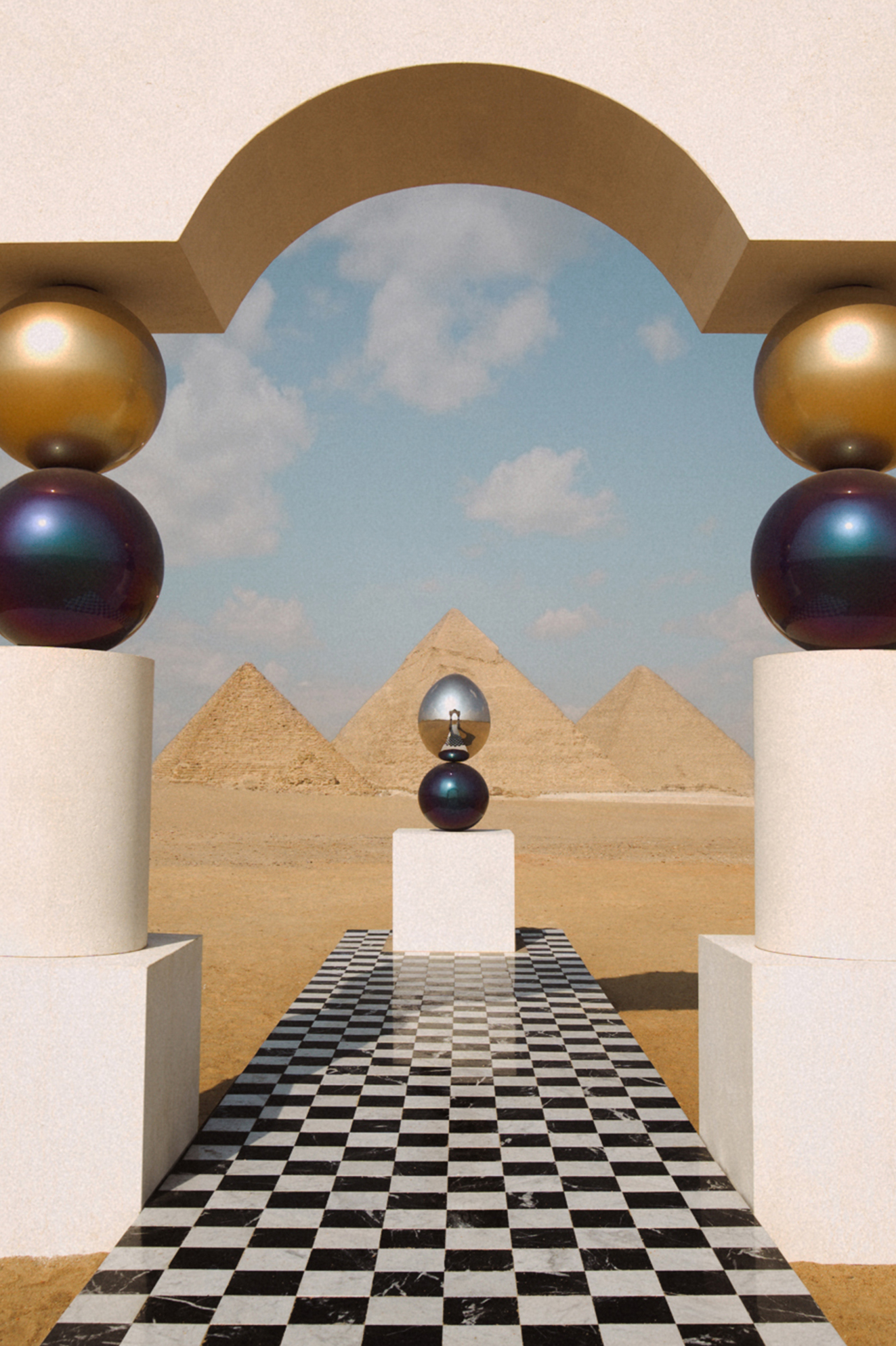 As visitors walk along the black-and-white checkerboard path, reminiscent of ancient Egyptian board games such as Senet, they encounter a mirror egg sculpture. The egg serves as a symbol of birth, growth, and creation, echoing Egyptian cosmology—particularly the myth of Thoth, the self-created deity who lays the cosmic egg containing all existence.