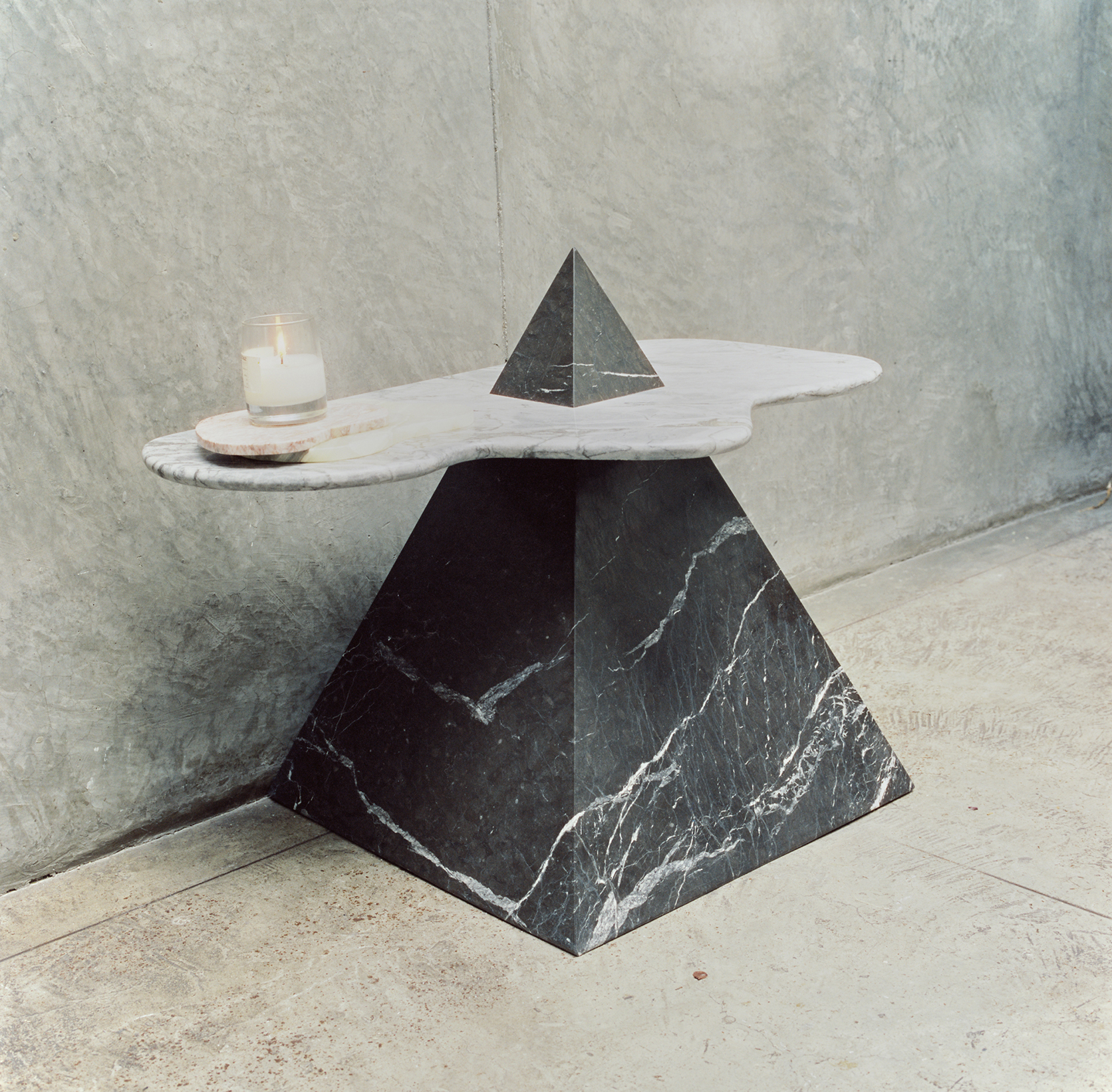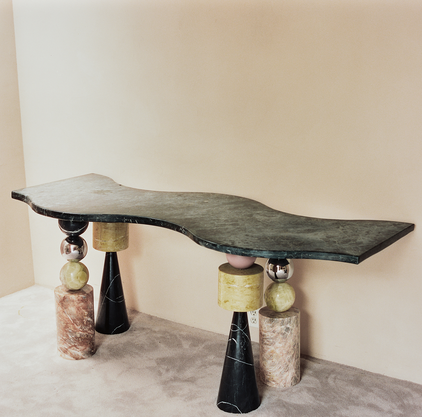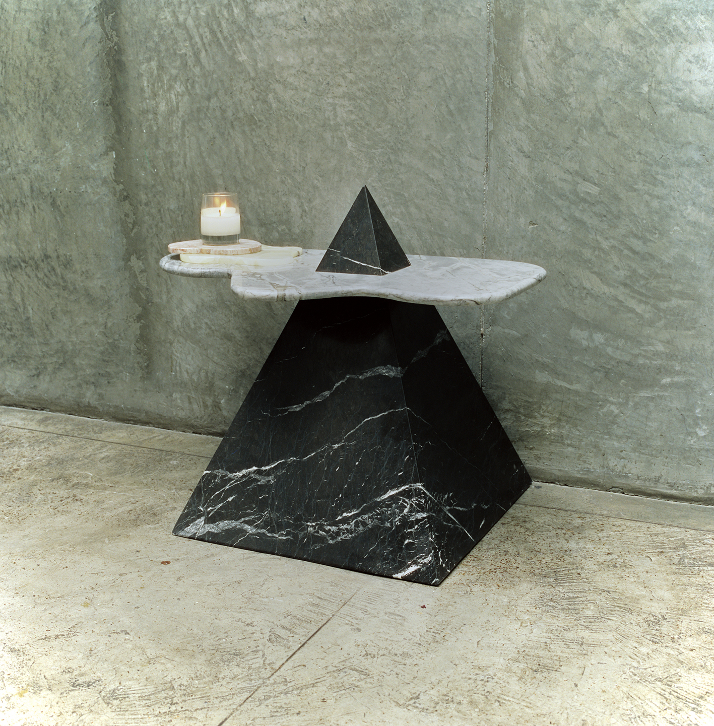 This is a series of experimental furniture pieces that explore the intersection of function, sculpture, and postmodern architecture. Each work combines marble and onyx with materials such as stainless steel and car paint, turning everyday objects into symbolic structures.