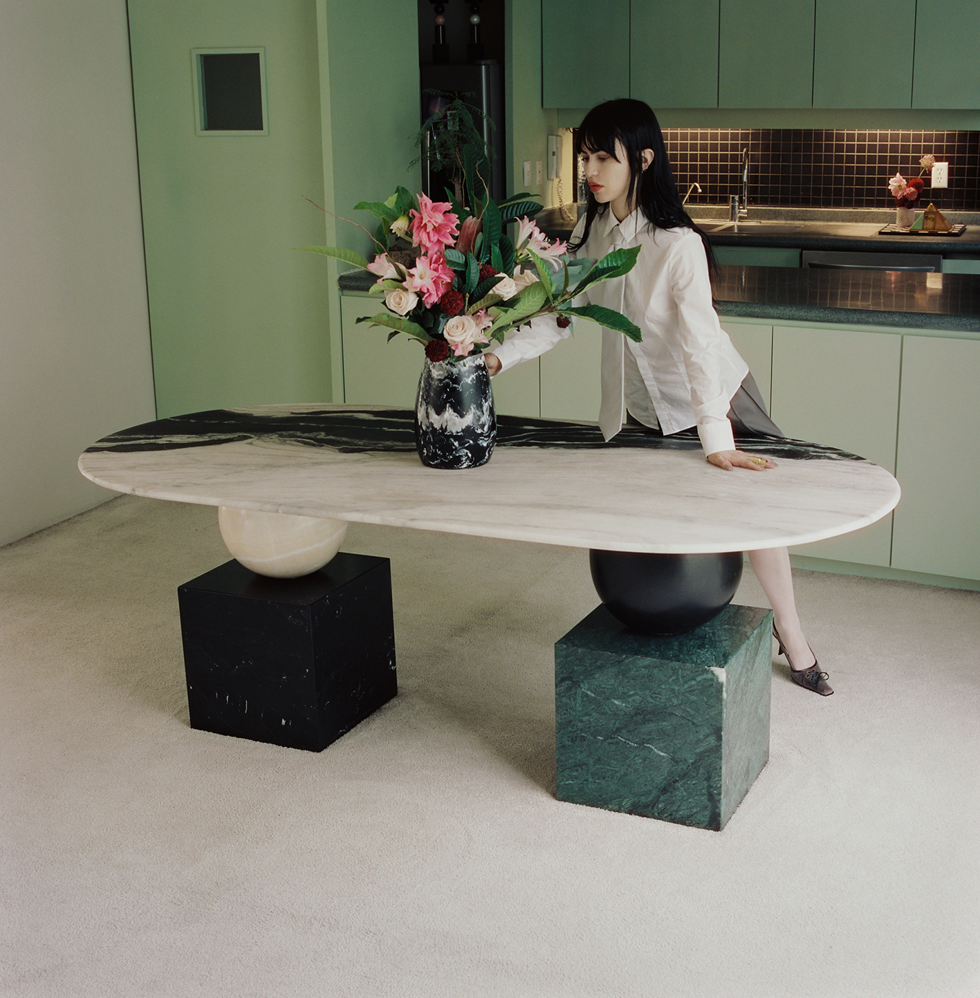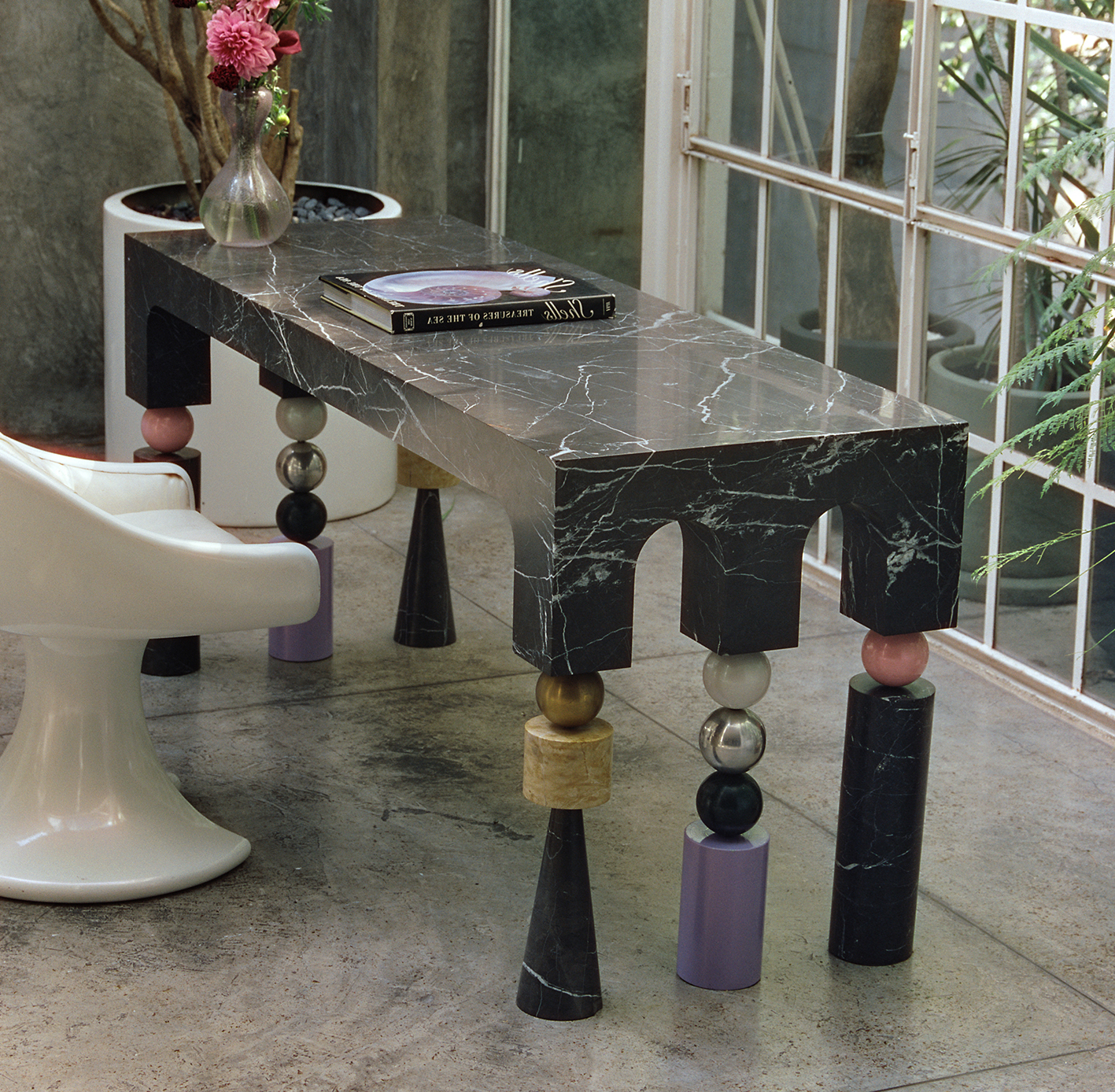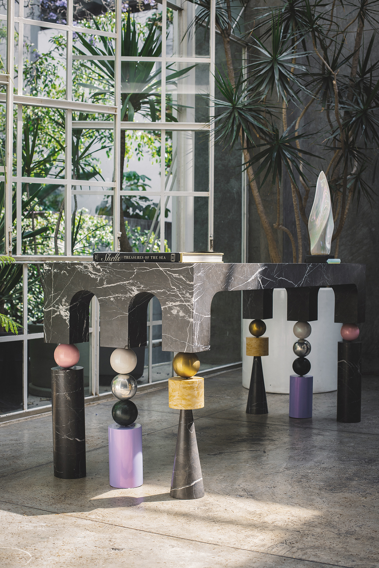 This is a series of experimental furniture pieces that explore the intersection of function, sculpture, and postmodern architecture. Each work combines marble and onyx with materials such as stainless steel and car paint, turning everyday objects into symbolic structures.